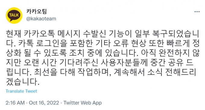 카카오톡 모바일 애플리케이션 서비스는 이날 오전 1시30분께부터 일부 복구됐다. 카카오톡 id는 최초생성 후 1회만 변경이 가능합니다.